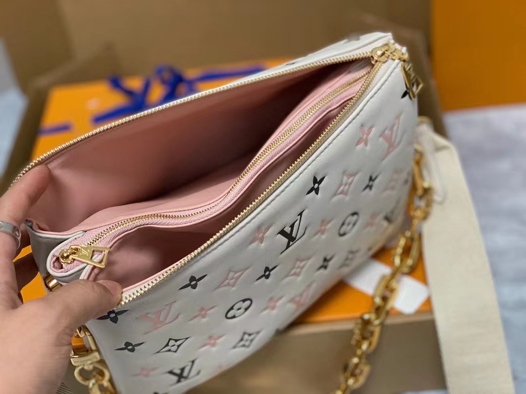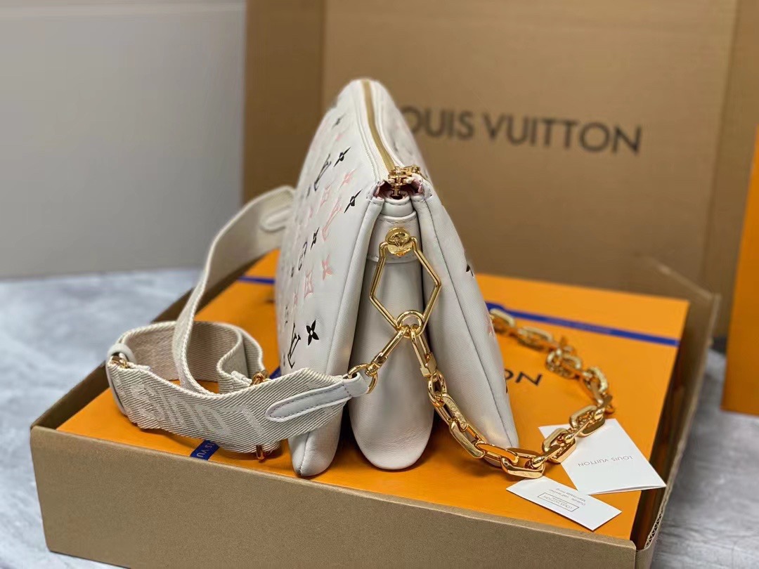 DetailThe new season's new cousin small handbag m57791 cousin small tricolor handbag from the p950 m22954 white full leather chain bag series has emerged in soft colors this summer. Sheepskin leather is embossed with a Monogram pattern, woven into the chain by the pool of silk scarves, bringing a trendy atmosphere to your face. Removable and adjustable leather shoulder straps add styling options. Detailed features 26 x 20 x 12 cm.