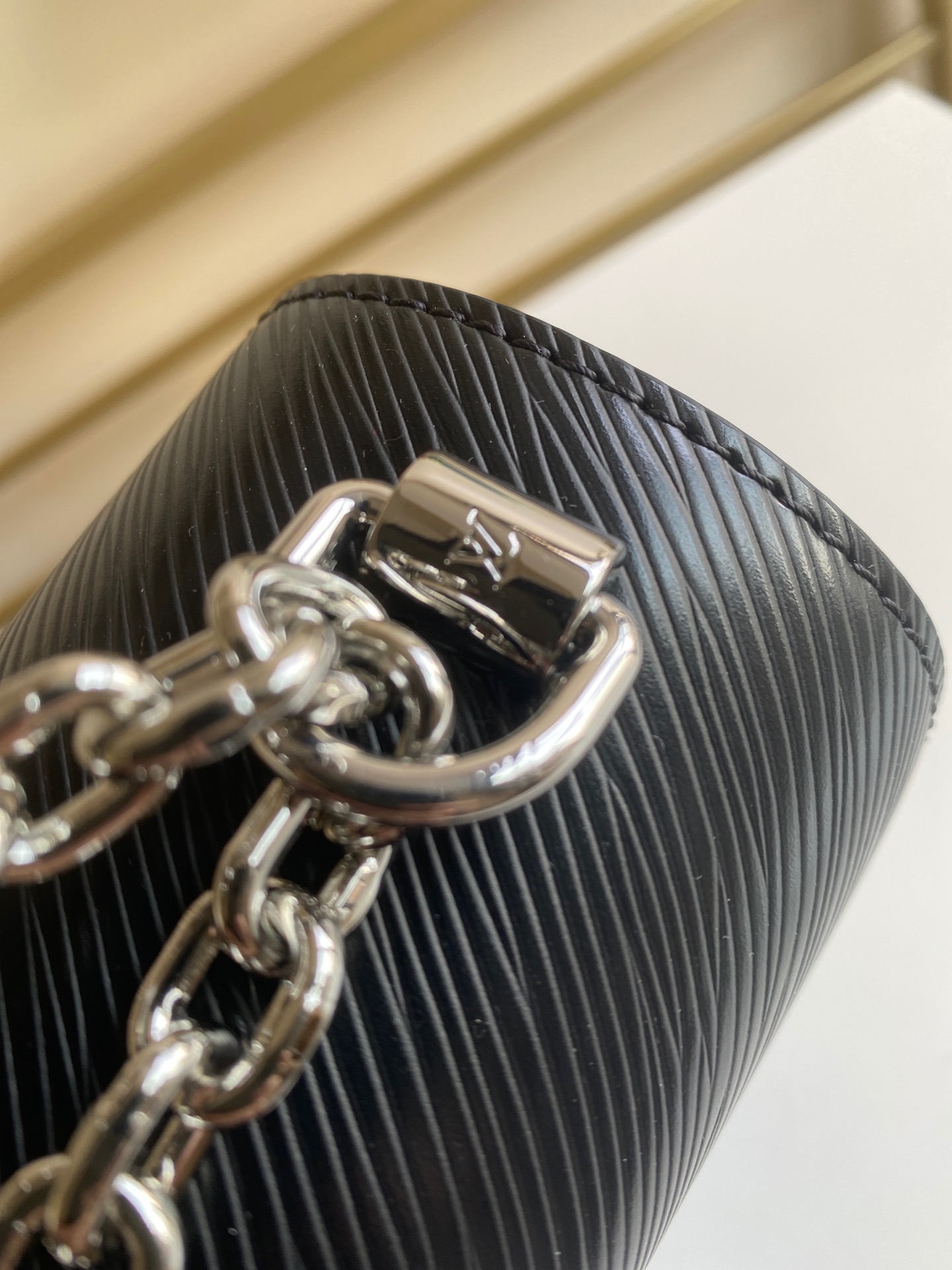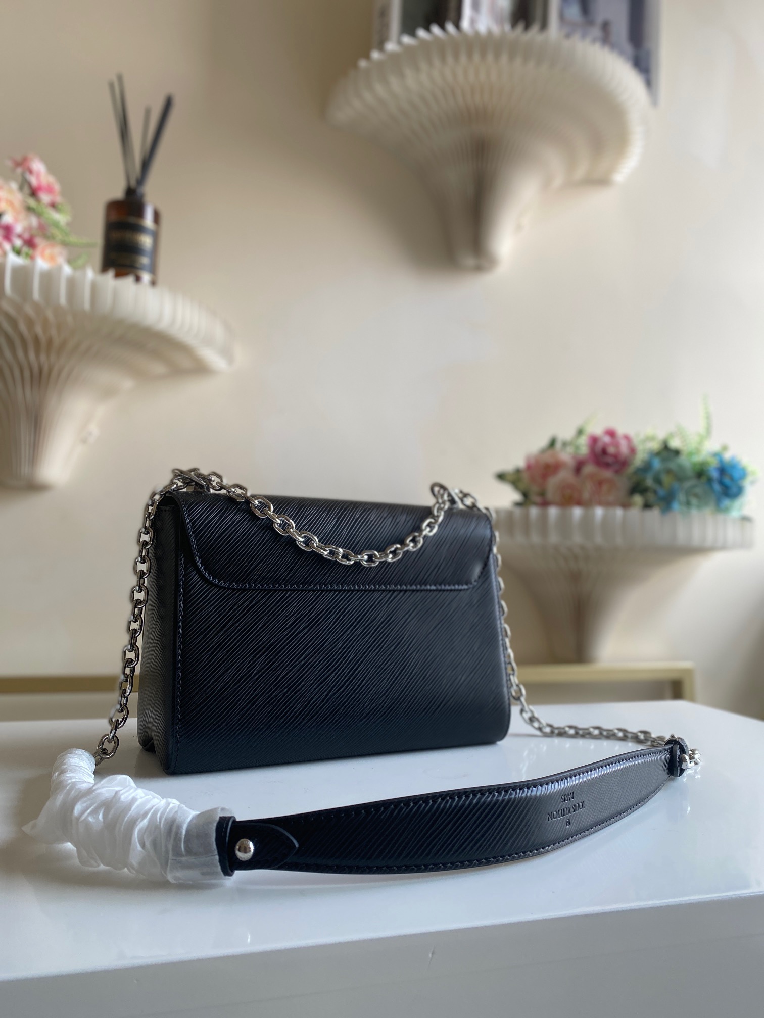 P850. Twist medium handbag m21110 black silver buckle twist m50282 chain bag first announced the Neoclassicism fashion in the 2015 cruise early spring series. This medium-sized handbag is made of brand iconic EPI leather and adorned with a sculptural twist lock, releasing a metallic shine. The hidden capacity mystery of the wavy bottom package; The sliding chain shoulder strap is folded or unfolded for a shoulder to shoulder or crossbody experience, presenting a beautiful appearance in day and night occasions. Size: 23 x 17 x 9.5cm